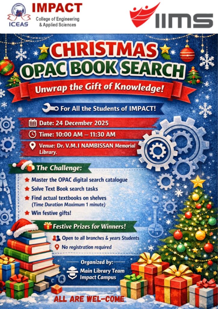 Get ready to unwrap the gift of knowledge! Join us for the Christmas OPAC Book Search on 24th December 2025, from 10:00 AM to 11:30 AM at Dr. V.M.I. Nambissan Memorial Library, Impact Campus.Fun challenges, festive prizes, and learning await all IMPACT students! 🎁✨
