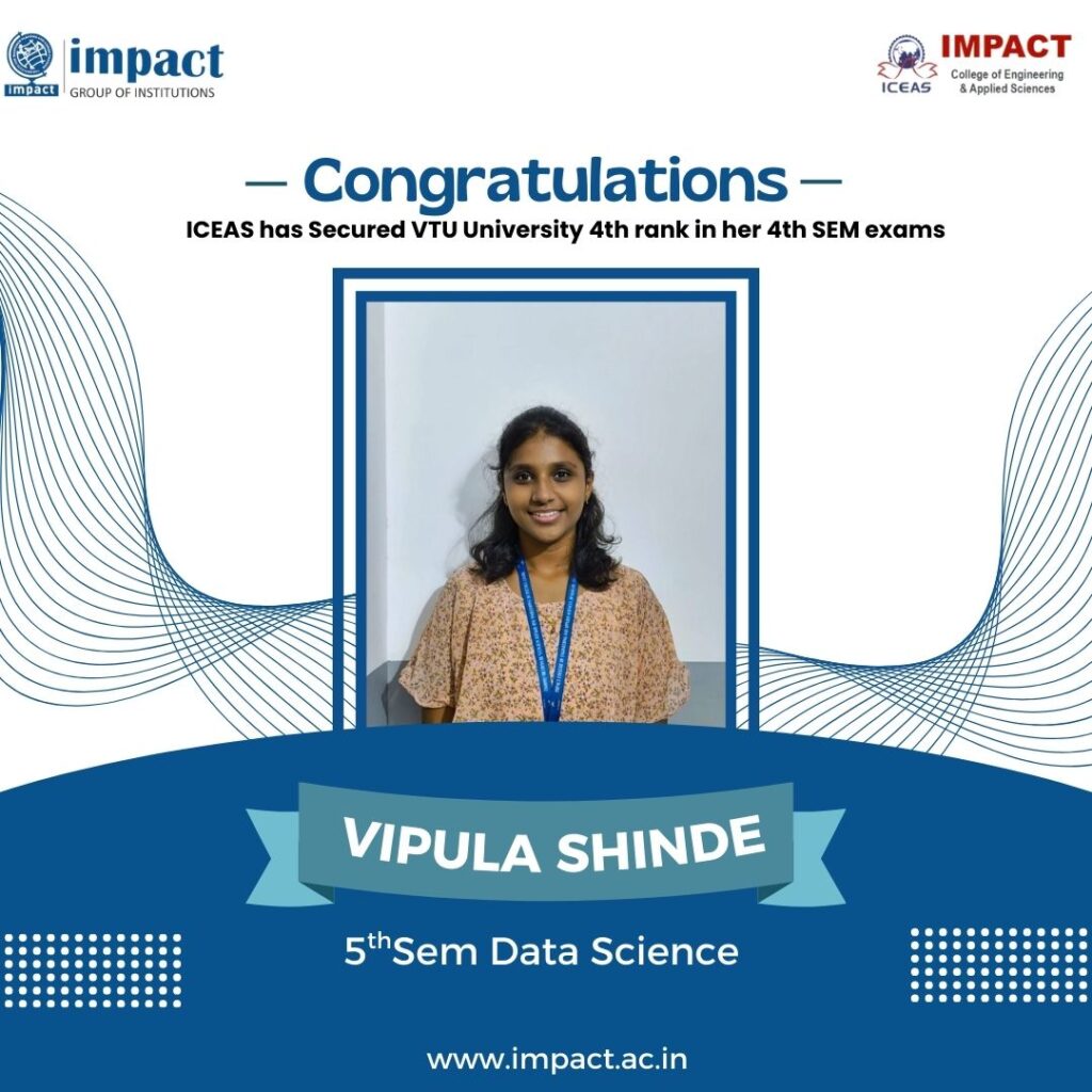 Congratulations to Ms. Vipula Shinde, a 5th Semester student from the Data Science Department, for securing 4th Rank in VTU during her 4th Semester exams! 🎉📚 Your hard work and dedication have brought pride to the Impact Group of Institutions. Keep shining! 💫