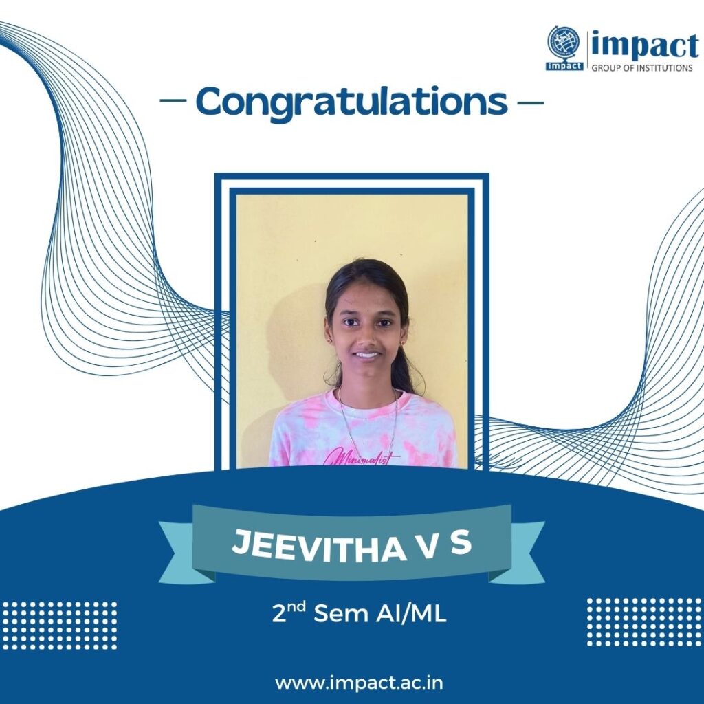 Proud to announce that Jeevitha V S from Impact College of Engineering and applied sciences achieved a perfect score in the Mathematics II Exam held in July 2025.A testament to her hard work and dedication. Congratulations, Jeevitha! 🌟